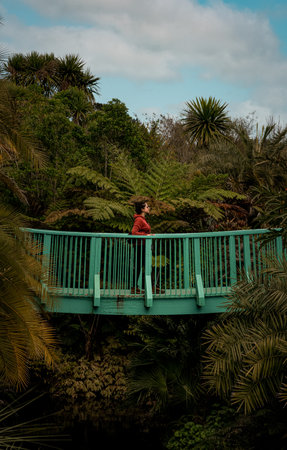 Woman walking through bridge in natural environment full of plants. Vertical photography