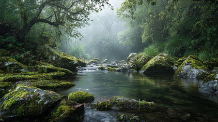 River in the rainforest with green moss and rocks, Thailand.