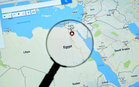 MONTREAL, CANADA - APRIL 09, 2017: Egypt and Cairo on Google Maps with Caution icon under magnifying glass.