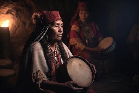 shot of a powerful and spiritual female shaman using her drum to lead people in prayer, created with generative ai