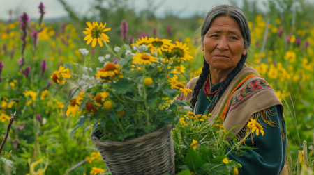 Old woman with a basket of flowers in the meadow at sunset
