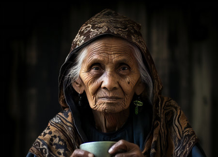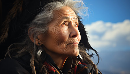 A wise elder gazes thoughtfully upward, his face etched with deep lines, wearing traditional clothing