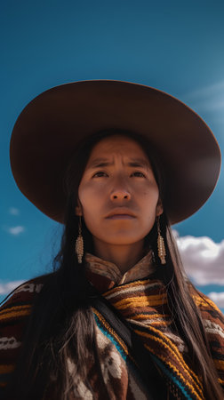 Proud indigenous girl in ceremonial outfit poses with beautiful mountain scenery behind, honoring her cultural roots.