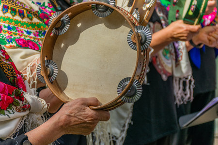 A detailed close-up of wrinkled, wise hands delicately holding and playing a wooden tambourine with pale heads and metal jingles. The colorful traditional costumes of Galician cantoeiras, adorned with flowers and embroidery, create a vibrant background evoking the cultural richness and joy of folk music, ideal for illustrating themes of tradition, music, Galician culture, festivals, and celebrations.