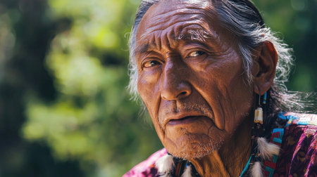 An elderly Native American man stands proud, adorned in a traditional headdress, gazing thoughtfully into the distance as sunlight casts a warm glow, highlighting his features and cultural heritage.