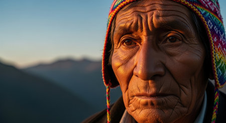 Indigenous elderly woman smiling wearing traditional textile clothing with mountains in background