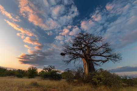 Sacred baobab is landmark on rocky cliff above the savannah in Botswana. An unusual baobab growing on mountain against the background of the evening sky.