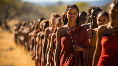 Group of young women standing in a row in the Okavango Delta, Botswana.