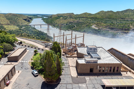 Vanderkloof, South Africa - Feb 21, 2023: Buildings and substation at the Vanderkloof Dam hydro-electric plant. It is the second largest dam in South Africa
