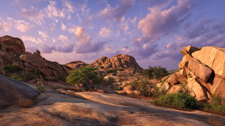 Bouldered Landscape at Dusk with Beautiful Sky and Rocky Hills