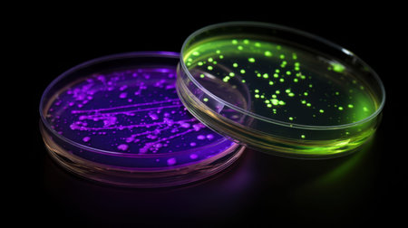 Close-up view of bacterial cultures in petri dishes glowing under UV light, showcasing vibrant colors for research and education in microbiology.