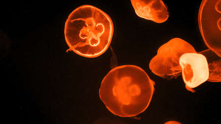 luminescent group of jellyfish swimming in the bottom of the sea. gelatinous forms