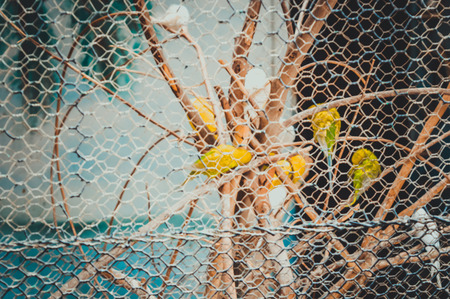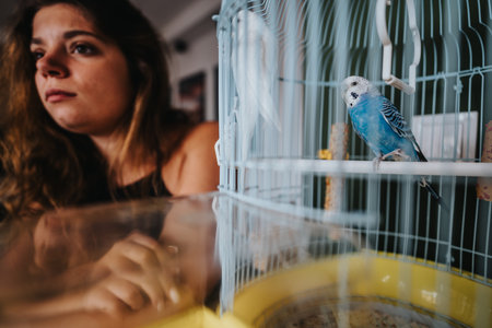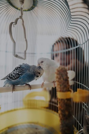 Two budgerigars perch together inside a wire cage, creating a charming visual of companionship and serenity. A person gazes at them, adding a touch of human connection and warmth to the scene.
