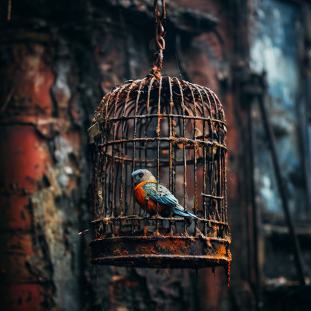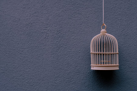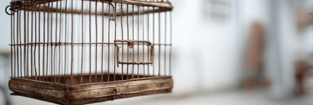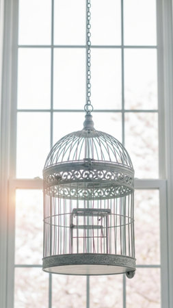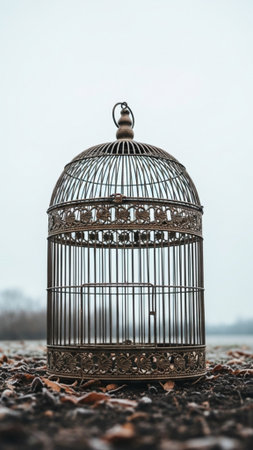 An aged birdcage swings gently in the breeze, surrounded by a serene backdrop, evoking a sense of nostalgia and reflecting on past companionship.