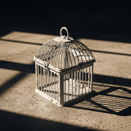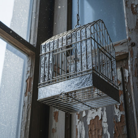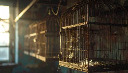 Golden sunlight streams through a dusty window, illuminating a row of old, empty birdcages. The silence is profound, hinting at songs once sung and the bittersweet memory of freedom.