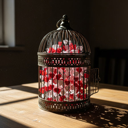 Detail shot of a decorative birdcage filled with tiny, meticulous paper heart cutouts, lit by harsh