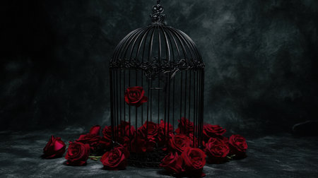 A striking composition featuring a delicate black birdcage surrounded by vivid red roses on a dark backdrop, creating an atmosphere of beauty and melancholy.