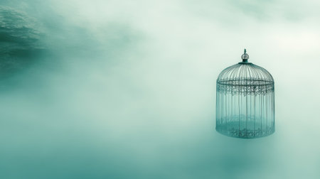 This striking image features a delicate birdcage floating gracefully in a dense fog. The ethereal atmosphere evokes feelings of mystery and tranquility, inviting viewers to ponder themes of freedom and solitude.