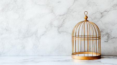 This image features an elegant vintage birdcage set on a marble countertop, captured with soft lighting for an aesthetic appeal in home decor.