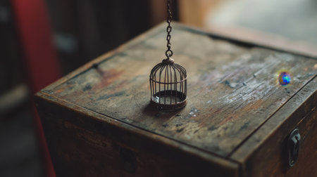 A small vintage bird cage hangs gracefully above a rustic wooden surface, enveloped in a warm atmosphere that evokes nostalgia and simplicity.