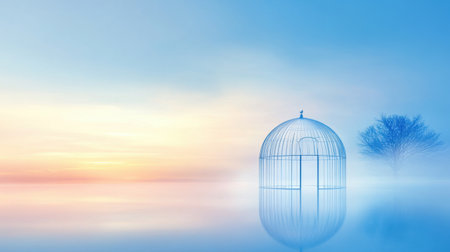 This calming scene features a delicate birdcage surrounded by soft blue mist at dawn, evoking feelings of tranquility and serenity in a minimalist landscape.