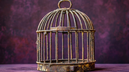 This image features a vintage rusty birdcage set against a dark background, symbolizing themes of freedom and confinement. The intricate metalwork and textures evoke nostalgia and artistic creativity in still life photography.