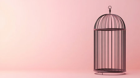 A vintage-style open birdcage sits elegantly against a soft pink background, creating a serene atmosphere. This minimalist composition evokes themes of freedom and isolation.