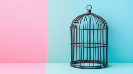 A delicate iron birdcage stands gracefully against a pastel pink and blue background, creating a striking visual contrast that symbolizes freedom and isolation.