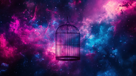 This captivating image features a delicate birdcage floating in a vibrant galaxy filled with colorful nebulae and bright stars, evoking a sense of wonder.