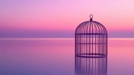 A stunning view of an empty birdcage sitting gracefully on still water, illuminated by soft hues of purple and pink during sunset, creating a serene atmosphere.