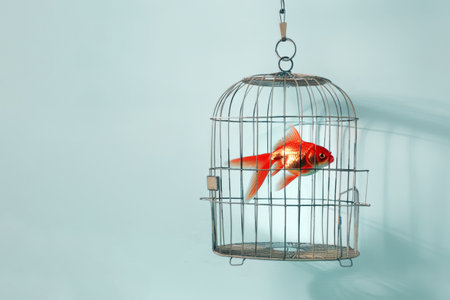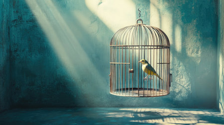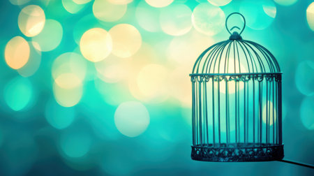 This captivating image features a delicate birdcage against a soft bokeh background in vibrant turquoise and gold hues. The aesthetic evokes themes of freedom and restraint.