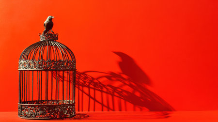 A vintage birdcage sits against a vibrant red backdrop. The small bird perched on top creates an artistic shadow, symbolizing freedom and confinement.