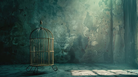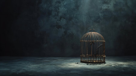 An abandoned vintage birdcage sits in a spotlight against a dark backdrop, evoking feelings of solitude and reflection. Perfect for artistic design.