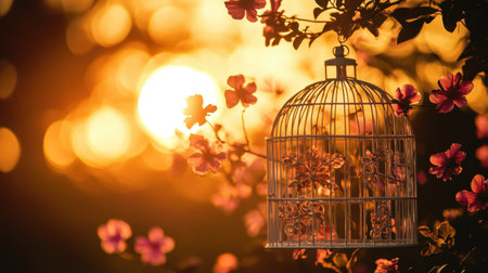 This captivating image features a delicate birdcage surrounded by vibrant flowers with a stunning sunset in the background, creating a serene and beautiful atmosphere.
