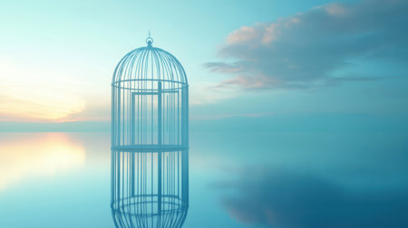 A tranquil scene depicting a delicate birdcage silhouette against a softly colored sky during sunset, beautifully reflected on still water below.