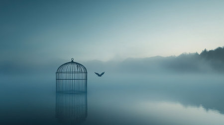 A serene birdcage stands in still water amid a foggy landscape, capturing a moment of tranquility as a bird takes flight, symbolizing freedom.