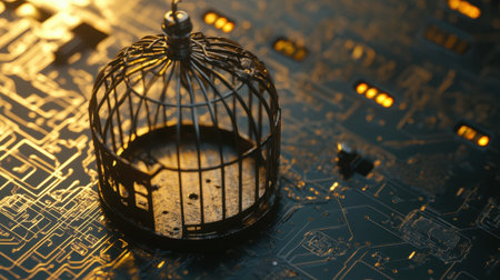 An intricate metal bird cage sits atop a detailed circuit board, highlighted by warm lighting that enhances its shadows and textures. The composition evokes themes of isolation and technology.