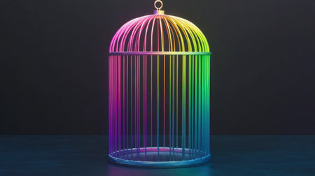 A vibrant and colorful birdcage design featuring a striking rainbow gradient set against a dark background, symbolizing creativity and freedom.