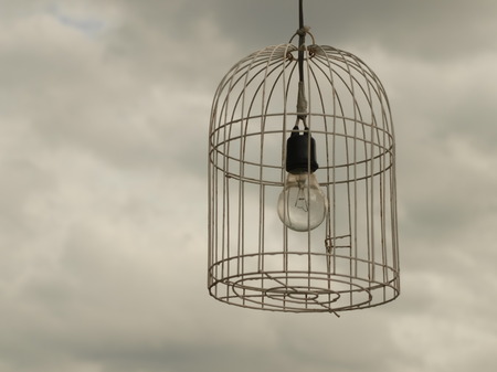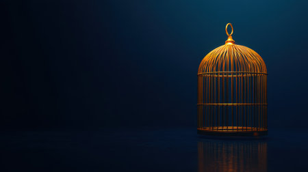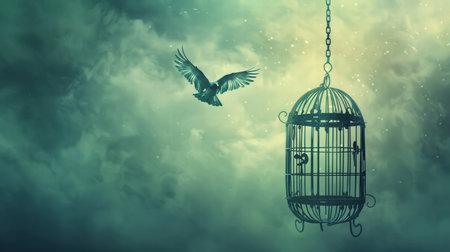 Person stands inside large birdcage, holding glowing light source, symbolizing hope and freedom. scene is set against twilight background, creating serene yet thought provoking atmosphere