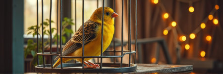Vibrant yellow bird perched in a cage with warm string lights in background. That the image is generated using AI.