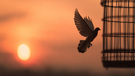 A dove emerges from a cage, silhouetted against a vibrant orange sunset. The image displays a bird in flight with outstretched wings near a dark cage. The composition utilizes backlighting and negative space, suggesting open skies. This scene could be used in various commercial or editorial projects related to freedom or liberation.