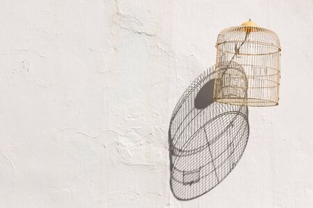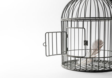 Freedom concept with an empty bird cage and the door open, symbolizing the bird escape and newfound liberty