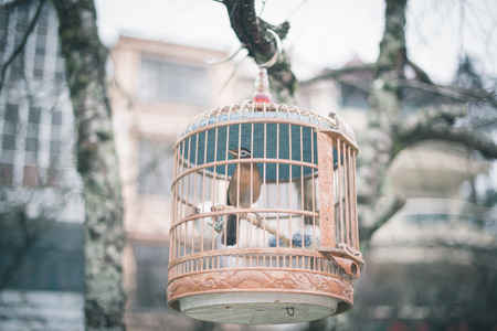 An evocative, low-angle editorial photograph capturing an old, simple, empty bird cage suspended nea
