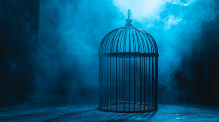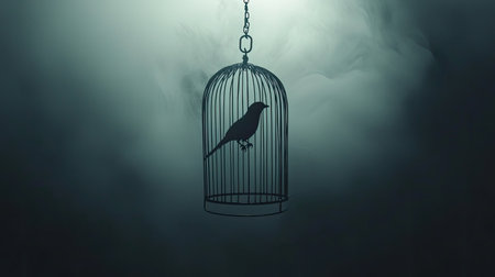 A striking silhouette of a bird inside a cage creates a captivating visual. Surrounded by mysterious fog, this image evokes deep emotions of solitude and confinement.