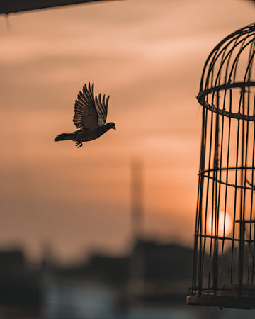 A bird takes flight near a cage in silhouette against a warm sunset. The image features a shallow depth of field, with soft focus on the background, emphasizing the bird's freedom. The composition suggests themes of liberation and overcoming limitations, ideal for editorial or commercial projects.