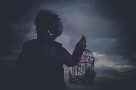 Surreal image representing a portrait of a male character with a cage on his face with an enclosed person swinging on a cloud. Surreal concept.