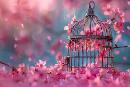 Featuring a pink cherry flowers are scattered in an old birdcage