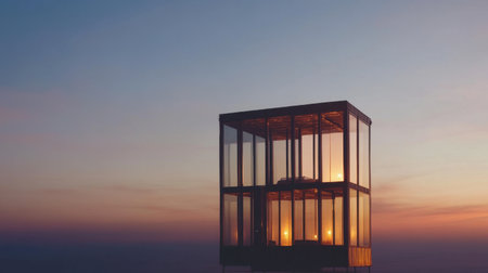 A stunning modern glass structure stands alone at sunset, showcasing a unique design against a vibrant sky, perfect for architectural and nature themes.