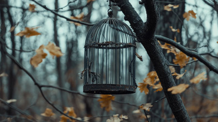 Visualize a dilapidated, empty birdcage hanging from a tree, evoking the feeling of being trapped and restricted --chaos 30 --ar 16:9 --v 6.1 Job ID: 20efb3a8-c66a-4caf-804a-8a627006e0ef