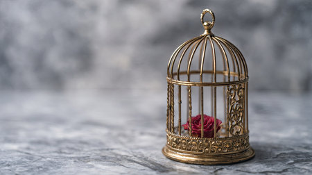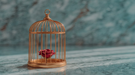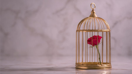 Vibrant red rose is enclosed inside a small, antique-style golden birdcage, positioned on a reflective surface with a soft, diffused light against a subtle, light-colored marble backdrop, creating a moody and symbolic still life composition.